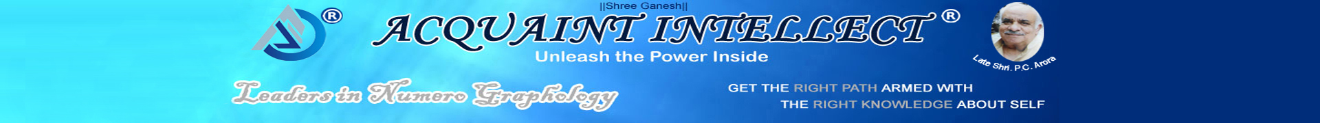 Acquaint Intellect is an organization started under the patron ship of Late Shri P. C. Arora, was a Senior Educationist & guiding force behind many Educational Training projects and Mr. Shalin Arora - One of the leading Numero-Graphologist, a Psycho-Graphologist- CHA (US) with Masters in HR & Marketing, Life Coach, Mind Trainer & NLP Expert, Author with skills to read Signatures.